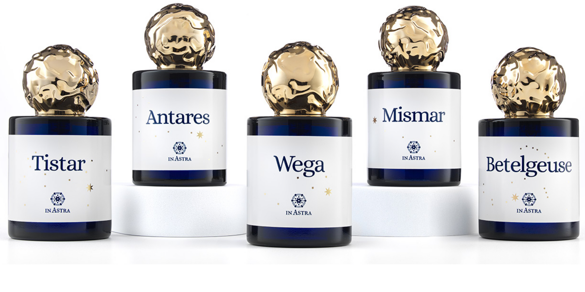 In Astra rend hommage à la beauté poétique de l’univers et de ses éléments. In Astra est l’union entre l’art de la parfumerie et l’astronomie. Ce projet artistique veut créer un parallélisme entre étoiles et parfum : les étoiles, comme le parfum d’ailleurs, sont toujours présentes sans être visibles et elles semblent être apparemment arrêtées, mais en évolution continue. Comme les astres changent leur état pendant leur vie, le parfum aussi se révèle peu à peu en dissipant, grâce aux notes de tête, de coeur et de fond.